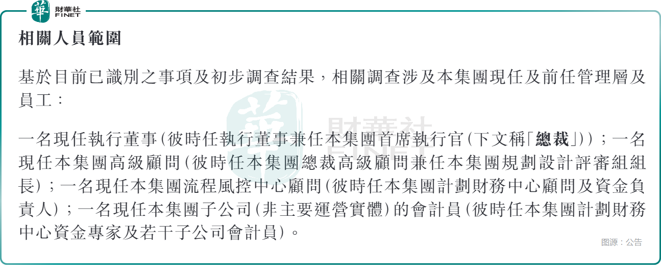 此次调查还触及了众多管理层:时任执行董事兼总裁、时任总裁高级顾问、时任计划财务中心顾问及资金负责人、时任资金专家等多名现任及前任核心人员,不是基层偶然操作失误能解释的。