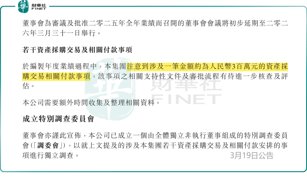 上任后,新管理层很快在编制2025年年度业绩过程中,发现异常交易痕迹。3月19日盘后,福寿园公告称,因在内部审计中发现一笔约300万元(人民币,下同)的资产采购交易存在文件及审批流程问题,已成立特别调查委员会,并预计将因此延迟发布2025年全年业绩。
