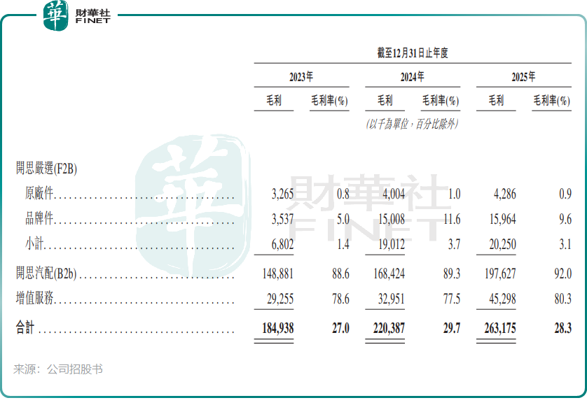 亏损的背后,是开思时代难以调和的盈利结构矛盾,这也是其商业模式最核心的痛点。公司形成了“高毛利平台引流+低毛利自营做大规模”的业务组合,其中轻资产的平台业务开思汽配堪称“利润奶牛”,2025年毛利率高达92.0%;但作为营收主力的自营业务“开思严选”,2025年毛利率仅为3.1%,其中核心的原厂件品类毛利率更是低至0.9%,几乎处于“赔本赚吆喝”的状态。