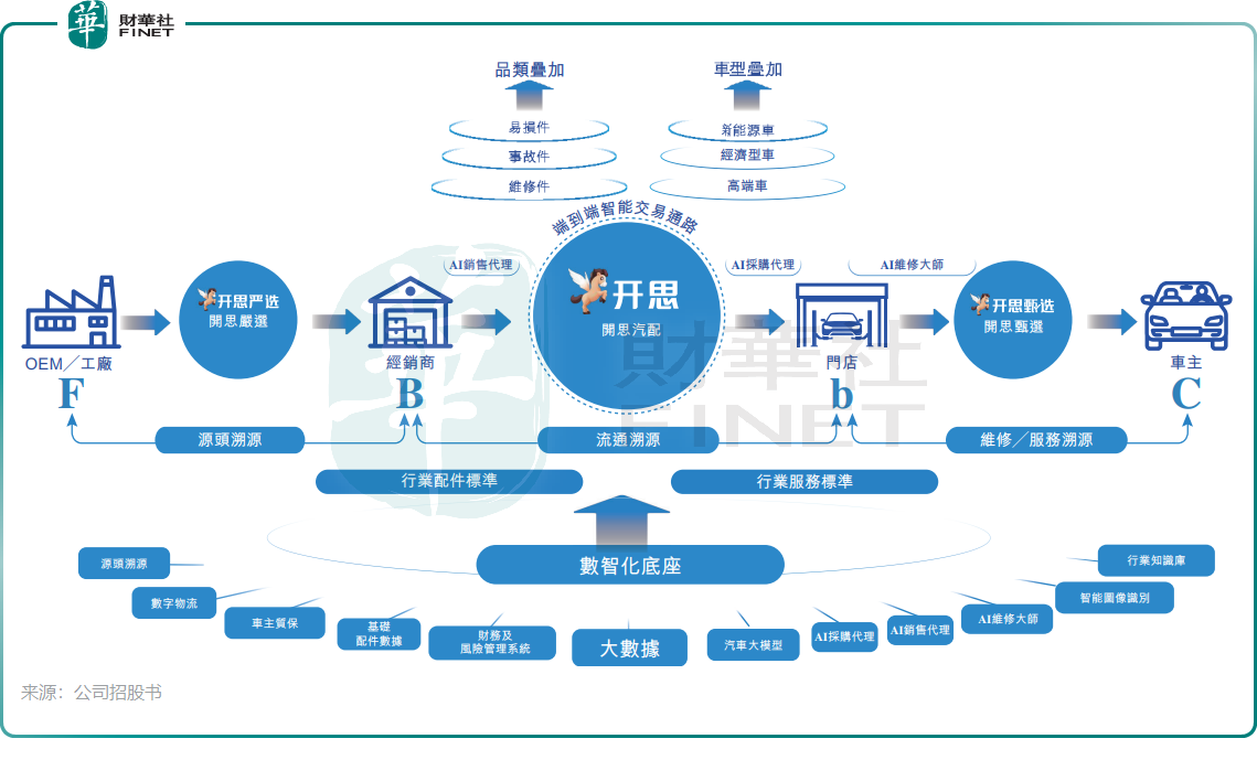 在极度分散、数字化程度偏低的国内汽车后市场,开思时代走出了一条差异化的发展路径。公司为汽车后市场全价值链参与者搭建了AI赋能的数字基础设施,独创的“F2B2b2C”模式,打通了从上游零部件制造商(F)、到汽配经销商(B)、汽车服务门店(b)再到终端车主(C)的完整价值链,形成了“重自营+轻平台”的双轮驱动业务组合。