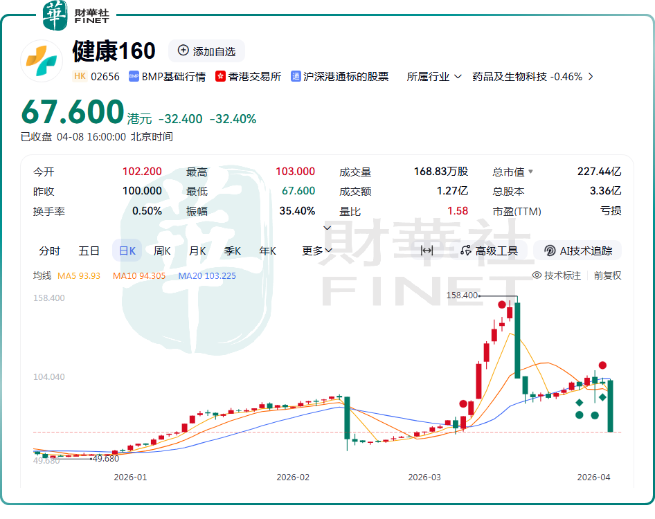 4月8日,国内最大的挂号平台——健康160(02656.HK)迎来大幅震荡,收盘暴跌32.4%,报67.6港元/股,让本就脆弱的市场情绪再遭冲击。