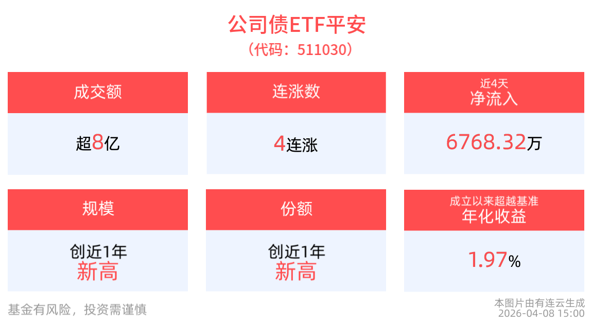 截至2026年4月8日 15:00,公司债ETF平安(511030)上涨0.03%, 实现4连涨。最新价报107.53元。拉长时间看,截至2026年4月8日,公司债ETF平安近半年累计上涨1.26%。