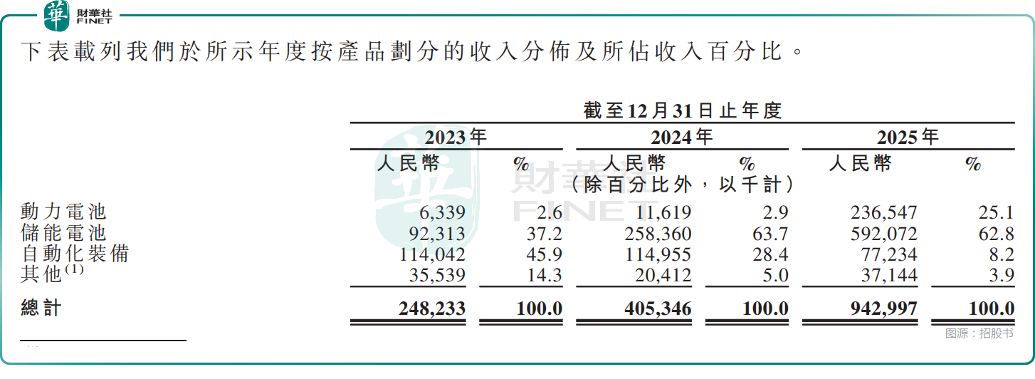 清陶能源的收入主要来源于动力及储能系统两大领域,亦有一部分收入来自销售用于电池生产及其他制造领域的自动化装备。数据显示,2023年至2025年,公司的动力电池业务收入从633.9万元增至2.37亿元,占总收入的比重也从2.6%提升至25.1%,储能电池的收入也大幅增长至5.92亿元,占总收入比重为62.8%,是增长核心支柱。