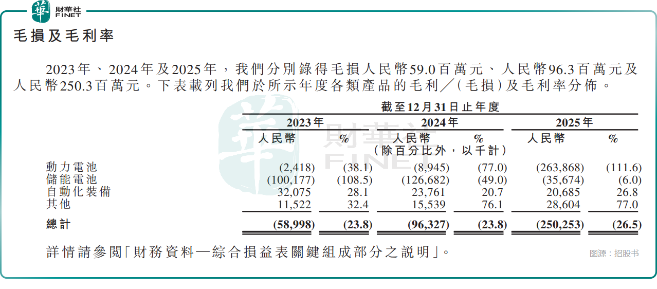 招股书显示,清陶能源毛利率长期为负,2025年整体毛利率-26.5%,其中动力电池业务毛利率低至-111.6%,意味着每卖出1元产品便亏损超1.1元。受此影响,公司三年累计净亏损超31亿元。2025年经调整后净亏损仍达7.66亿元。