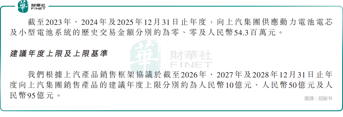 招股书显示,清陶能源的固态电池产品已搭载于上汽旗下智己、名爵(MG)及福田等知名汽车OEM逾30款乘用车、商用车车型,交付超过1.68万套。另外,清陶能源根据上汽产品销售框架协议于2026年、2027年及2028年向其销售产品的建议年度上限分别为10亿元(人民币,下同)、50亿元和95亿元。