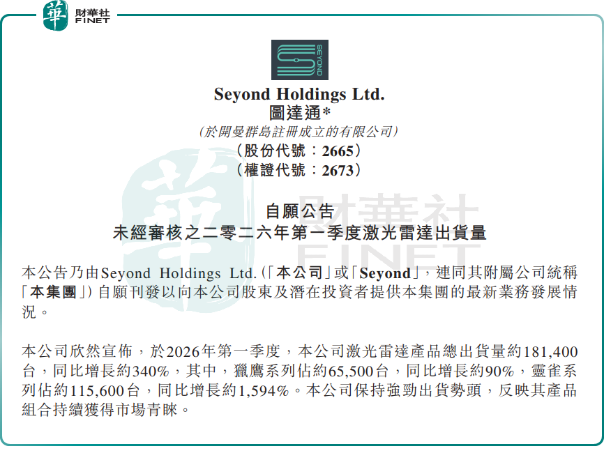 图达通公告显示,2026年第一季度,公司激光雷达产品总出货量约18.14万台,同比增长约340%。细分产品来看,猎鹰系列占约6.55万台,同比增长约90%,灵雀系列占约11.56万台,同比增长约1594%,成为拉动增长的核心主力。