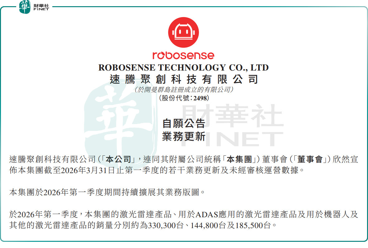 无独有偶,另一行业龙头速腾聚创2026年一季度销量同样呈现爆发式增长。期内,公司激光雷达总销量达33.03万台,同比增长204.1%。其中ADAS车载激光雷达销量14.48万台;机器人业务销量达18.55万台,同比暴涨1458.8%,销量占比达56.2%,首次超越车载业务,成为公司第一大增长动力。