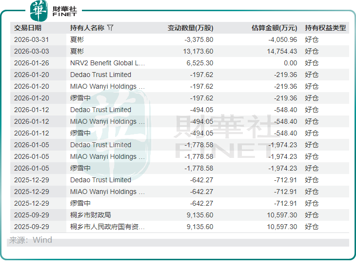 Wind数据显示,公司董事会主席、执行董事、首席执行官缪雪中自2025年12月底至2026年1月20日进行了四次股份减持,累计减持超3100万股,套现超过3400万港元。最后一次套现后,缪雪中持有公司股权比例为70.45%,仍牢牢掌握着公司控股权。