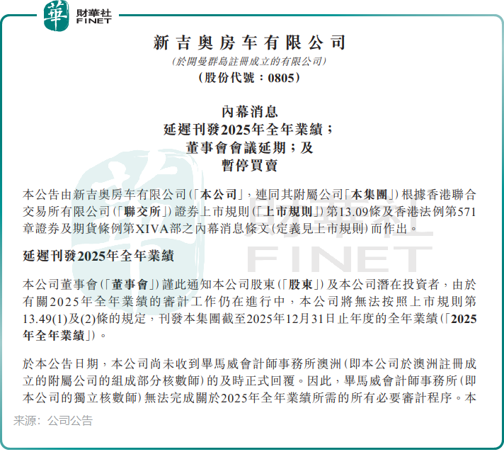 3月31日,新吉奥房车公告称,“由于有关2025年全年业绩的审计工作仍在进行中”,公司将无法按规定刊发全年业绩,股份预计将于4月1日上午9时起暂停买卖。