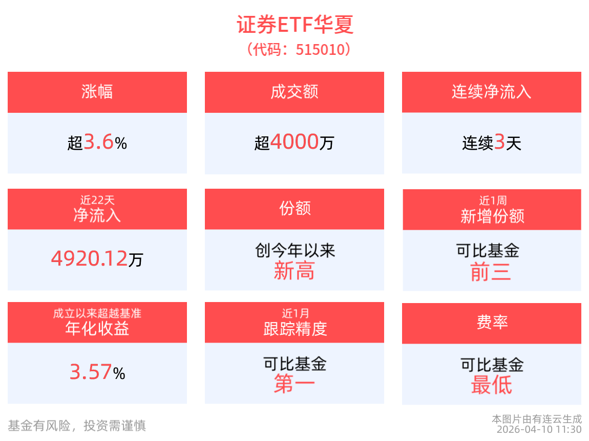 4月10日,受隔夜美股大涨利好,A股三大指数携手走强,大金融板块全面爆发,截至午间收盘,证券ETF华夏(515010)上涨3.63%,其持仓股中信证券上涨7.04%,东方财富上涨4.75%,长江证券、广发证券、兴业证券等个股跟涨。统计显示,证券ETF华夏近3天获得连续资金净流入。
