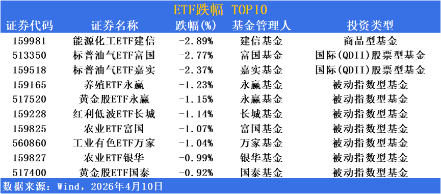 受美伊达成两周停火协议影响,国际油价一度暴跌近20%,能源化工及油气相关板块遭遇获利了结,领跌ETF市场。