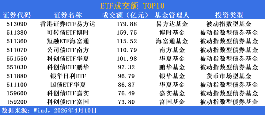 香港证券ETF易方达(513090)单日成交179.88亿元位居成交榜榜首,受益于港股通流动性改善及港股券商估值修复预期,资金大举涌入高弹性金融板块。可转债ETF博时(511380)单日成交159.75亿元,短融ETF海富通(511360)成交115.52亿元,公司债ETF南方(511070)成交110.79亿元,债券ETF持续担当资金避风港。
