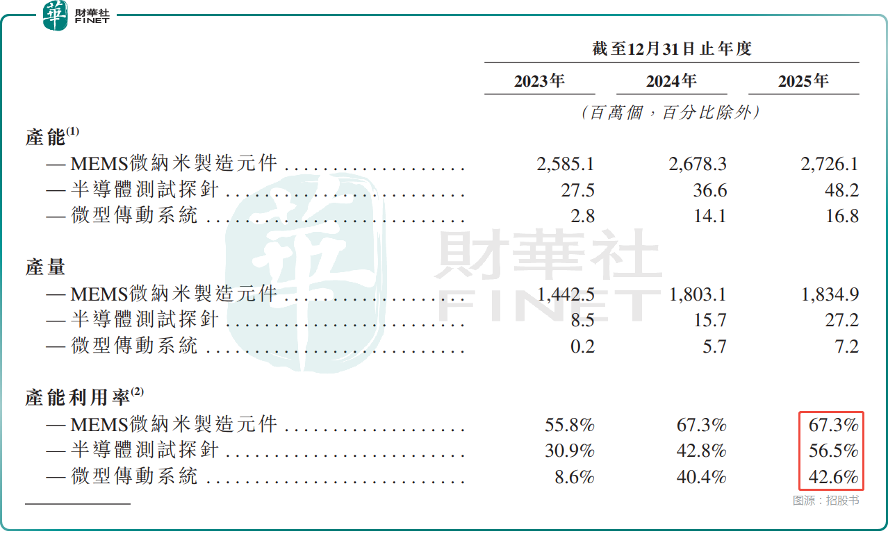 值得注意的是,根据招股书披露,其实2025年公司三大业务的产能利用率均未饱和:MEMS微纳米制造元件为67.3%,半导体测试探针持续提升至56.5%,微型传动系统仅为42.6%。