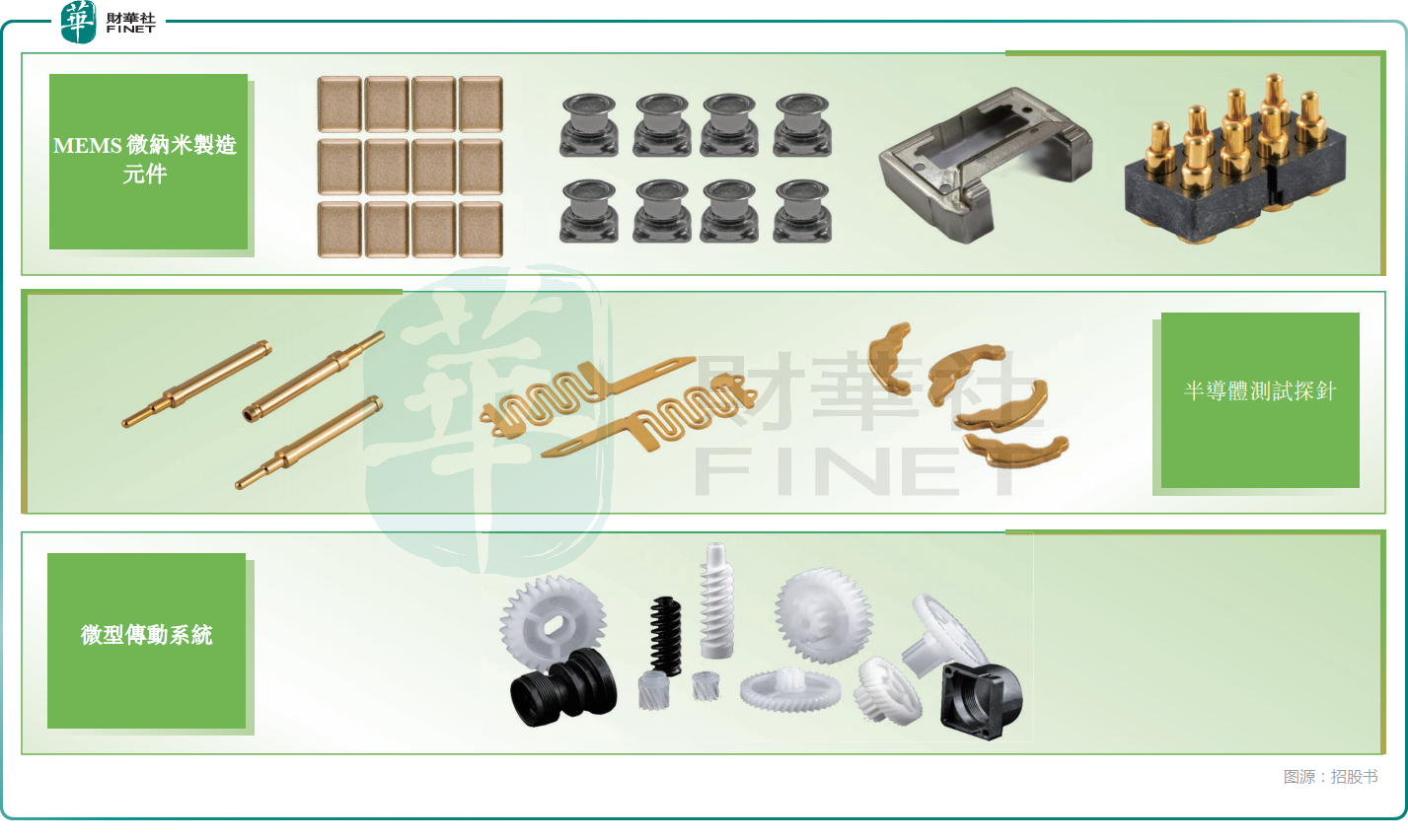 具体而言,公司的主要产品包括:(i)MEMS微纳米制造元件,其为微型化结构装置,包括用于声学及压力传感器的屏蔽盖、微机械结构及微型连接器。MEMS元件集成于智能手机、AR/VR头戴式设备、医疗助听器及蓝牙扬声器中,用于语音捕捉、噪音控制及气压感测;(ii)半导体测试探针,其为关键消耗品,在设计验证、晶圆级测试及封装后测试期间形成测试设备与芯片之间的电气连接。公司的探针用于测试驱动5G智能手机及AI/数据中心计算的逻辑、存储器、模拟、电源及射频器件;(iii)微型传动系统,其为精密机械组件,包括微电机、齿轮及相关部件,可在紧凑空间内实现动力传输及运动转换。