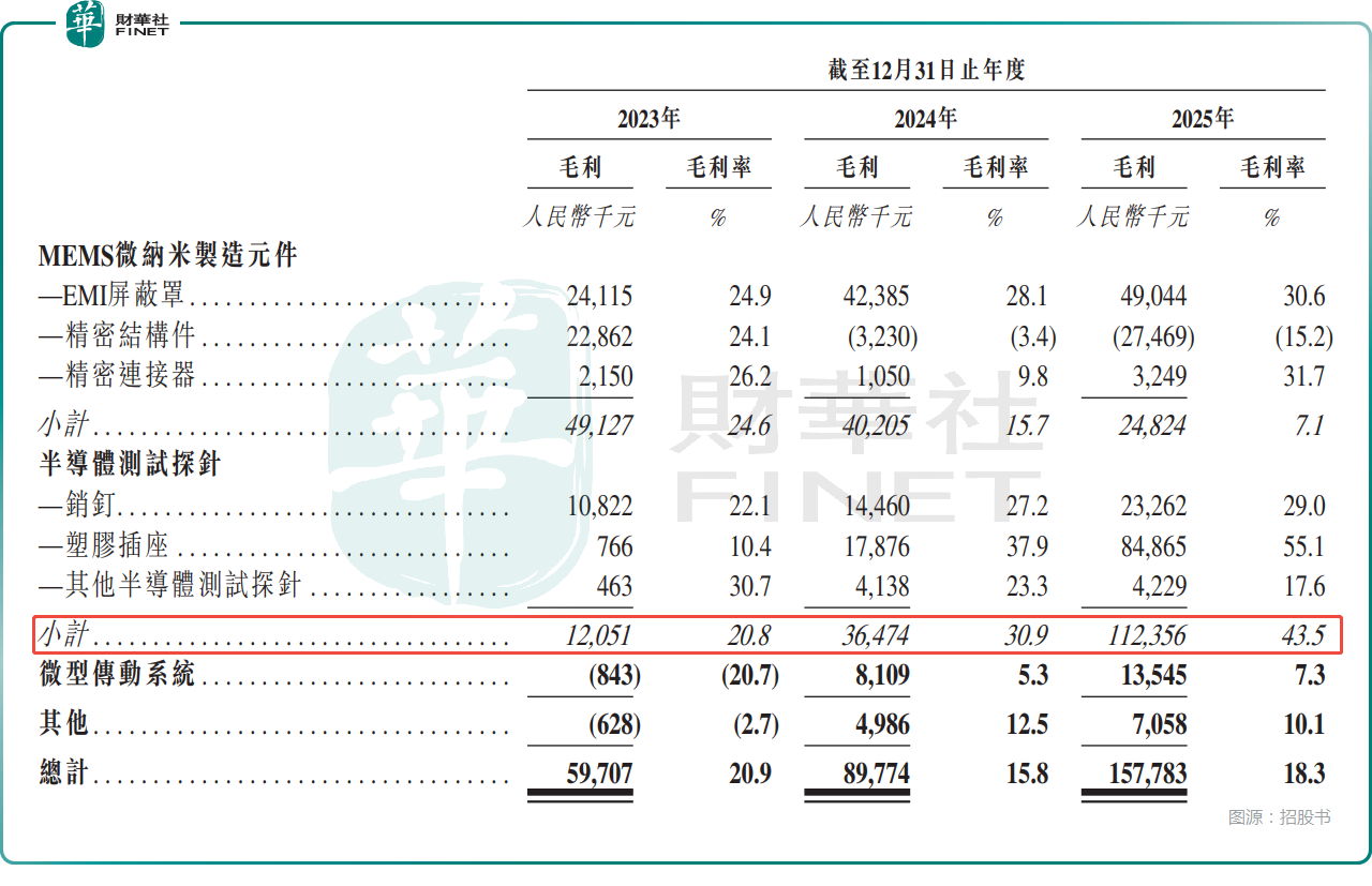招股书揭示了一个残酷的真相:和林微纳的盈利并非普惠式的繁荣,而是高度依赖于半导体测试探针这一单一业务。2023年至2025年,半导体测试探针业务的收入从5781.8万元增至2.58亿元,占总收入的比重从20.3%升至29.9%,毛利率则从20.8%一路增至43.5%,贡献超过七成的毛利,也助力公司整体毛利率从2024年的15.8%回升至2025的18.3%。