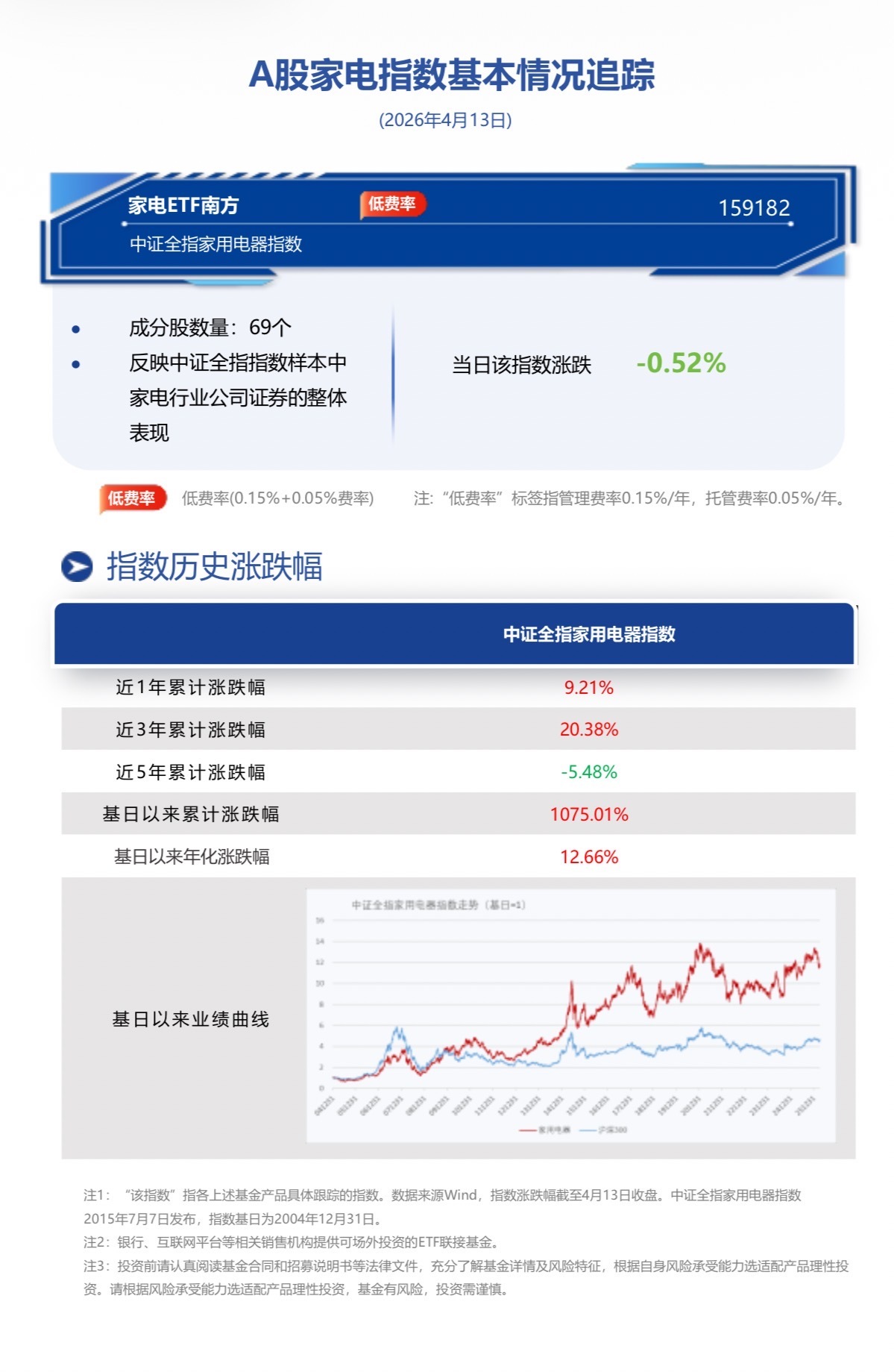 家电ETF南方(159182)重磅发售中!截至2026年4月13日收盘,家电ETF南方(159182)跟踪标的指数中证全指家用电器指数(930697.CSI) 跌-0.52%。