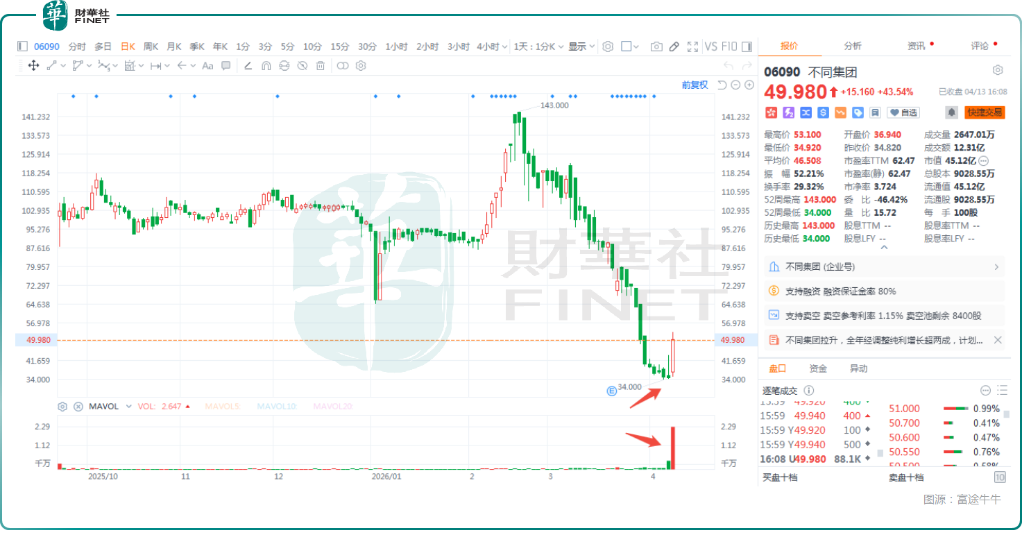 需要指出的是,其实就在前一个交易日(4月10日),不同集团就已经出现显著异动,盘中一度飙升约25%,但随即大幅回落,最终平收,但成交量已经大幅放大。