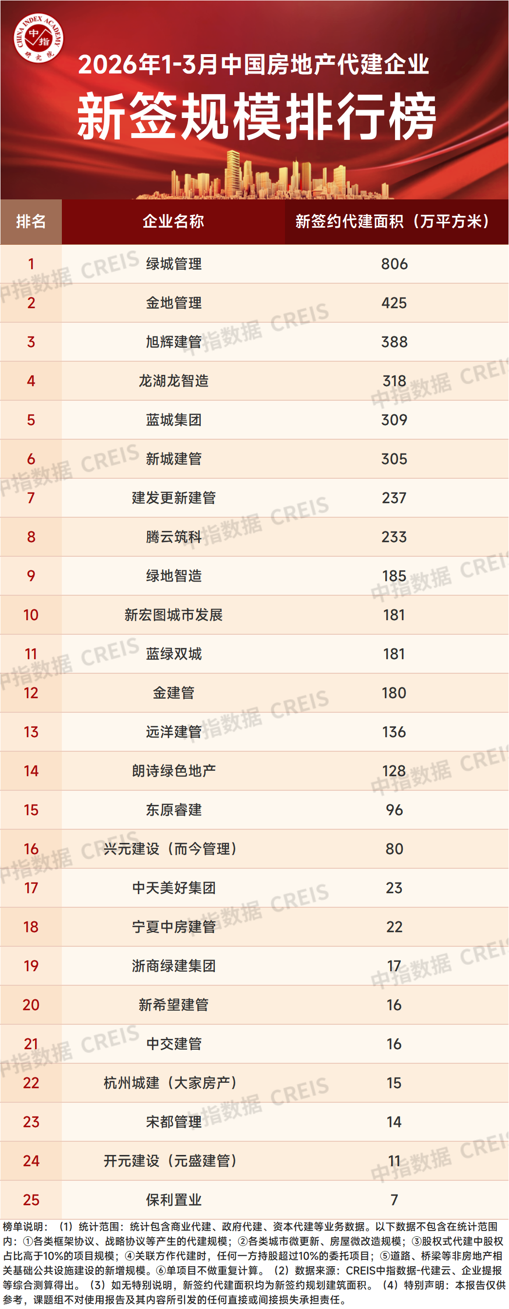 近几年我国房地产在构建新发展模式,房地产代建受到行业关注,获得了较快发展。在此背景下,中指研究院以数据为基础,对2026年1-3月房地产代建企业的总新签规模、政府代建新签规模、代建销售规模、特色项目等进行研究,关注行业最新动态,为行业研判代建发展情况提供参考。