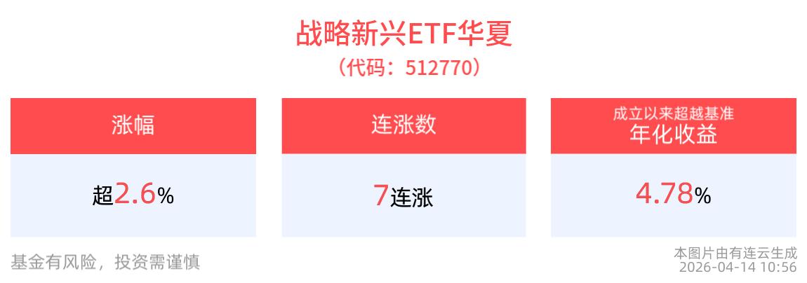 截至2026年4月14日10:56,中国战略新兴产业成份指数(000171)强势上涨2.64%,成分股珂玛科技上涨14.02%,沪电股份、宏和科技双双涨停,微导纳米,大族数控等个股跟涨,战略新兴ETF华夏(512770)上涨2.65%, 冲击7连涨。最新价报2.33元。拉长时间看,截至2026年4月13日,战略新兴ETF华夏近1周累计上涨11.12%。