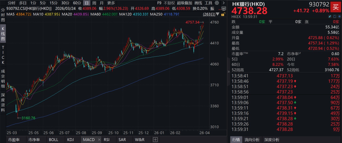 截至2026年4月14日 14:00,HK银行指数(930792)盘中创历史新高,一度涨超1%,现涨0.89%,成分股渣打集团(02888)上涨2.25%,中银香港(02388)上涨1.97%,农业银行(01288)上涨1.55%,中信银行(00998)上涨1.38%,汇丰控股(00005)上涨1.08%。