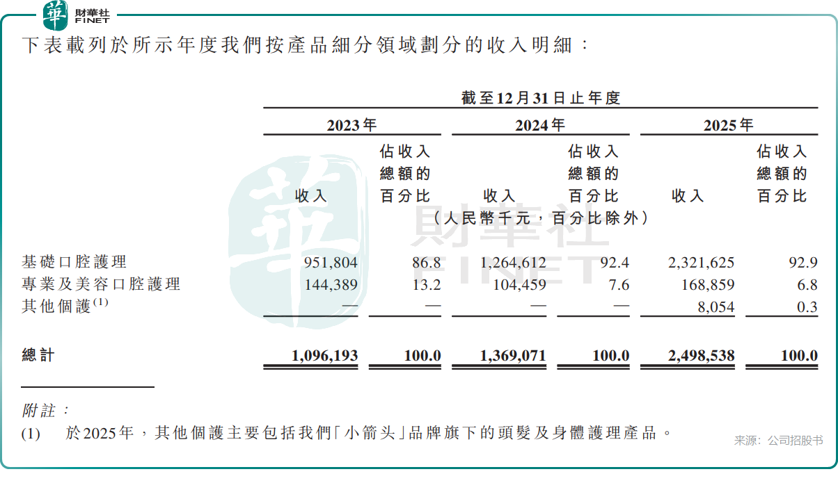 小阔科技产品线看似全面,覆盖牙膏、牙刷、漱口水、口腔喷雾乃至个护产品“小箭头”。但招股书揭示了一个危险信号:基础口腔护理(主要是牙膏)的收入占比从2023年的86.8%持续攀升至2025年的92.9%,而专业及美容口腔护理(漱口水、牙线等)则从13.2%萎缩至6.8%。2025年推出的个护品牌“小箭头”全年收入仅805.4万元,占比0.3%。
