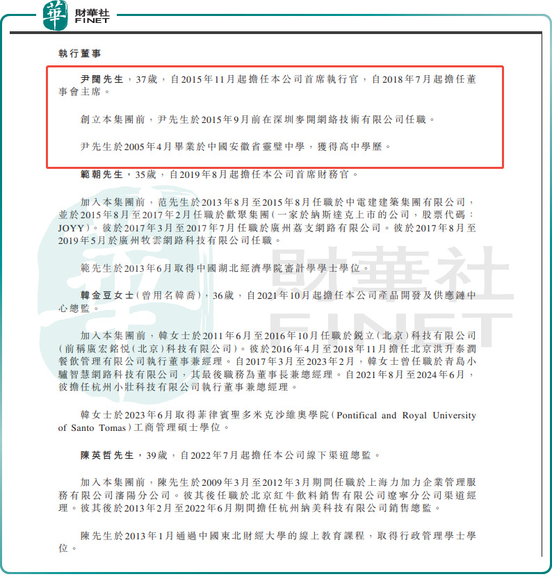 另外,小阔科技管理团队偏年轻化。控股股东、董事长及首席执行官尹阔非常年轻,才37岁,只有高中学历。根据招股书资料显示,尹阔,自2015年11月起担任小阔科技首席执行官,自2018年7月起担任董事会主席。创立小阔科技前,尹阔于2015年9月前在深圳麦开网络技术有限公司任职。尹阔于2005年4月毕业于中国安徽省灵璧中学,获得高中学历。