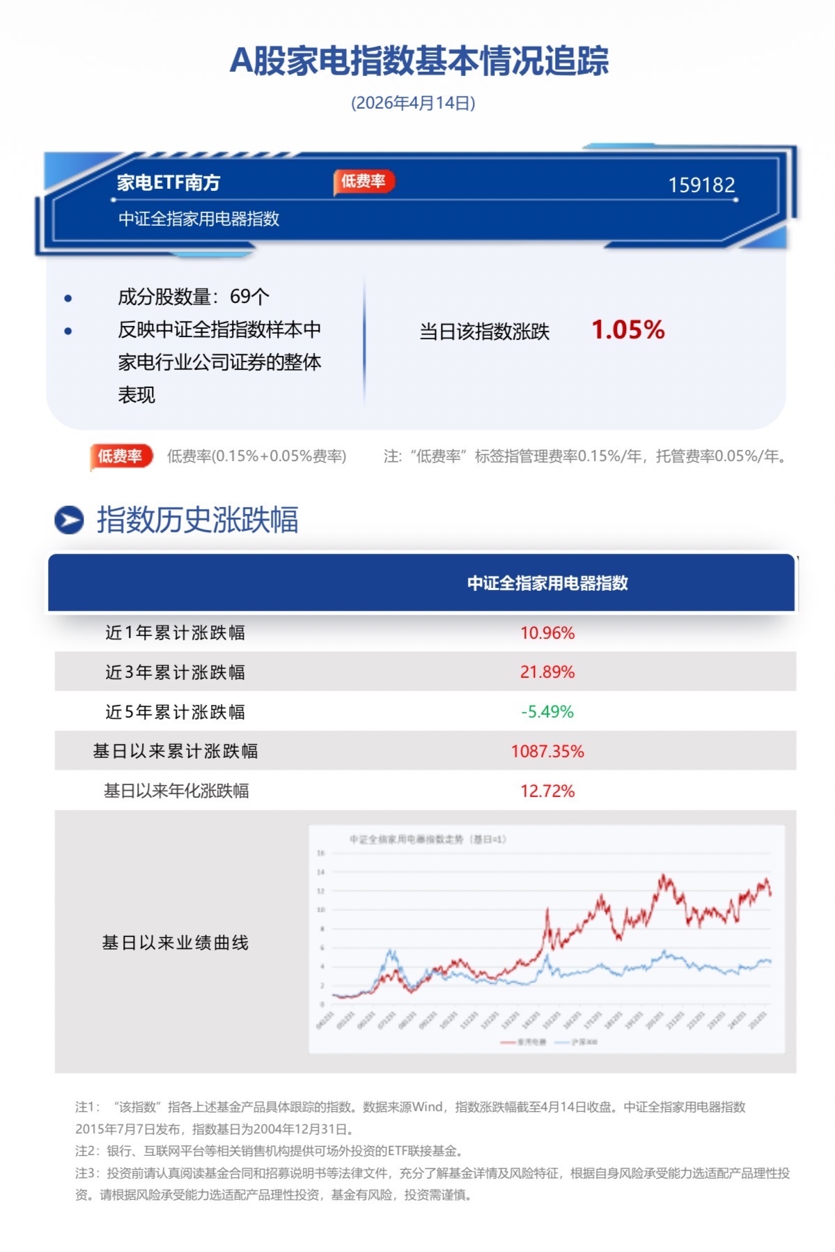 南方基金旗下家电ETF南方(159182)正在发售中!截至2026年4月14日收盘,家电ETF南方(159182) 跟踪标的指数中证全指家用电器指数(930697.CSI) 涨1.05%。