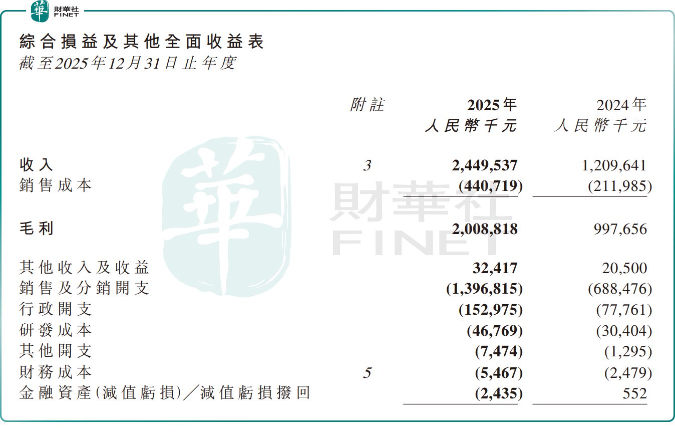 从业绩表现来看,林清轩2025年交出了一份靓丽的成绩单:公司录得收入24.5亿元(单位人民币,下同),同比增长102.50%;归母净利润3.6亿元,同比增长92.9%。