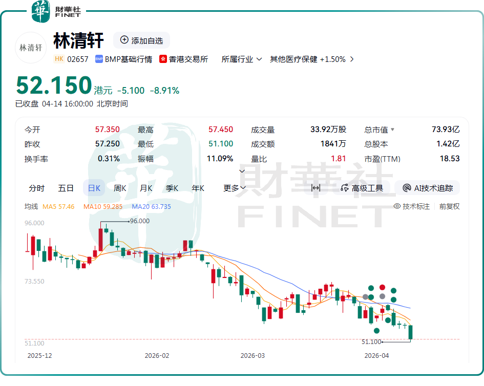 4月14日,“国货高端护肤第一股”林清轩(02657.HK)股价延续下行态势,盘中一度下探至51.1港元,创上市以来新低;截至收盘,该股跌幅为8.91%,报52.15港元/股。