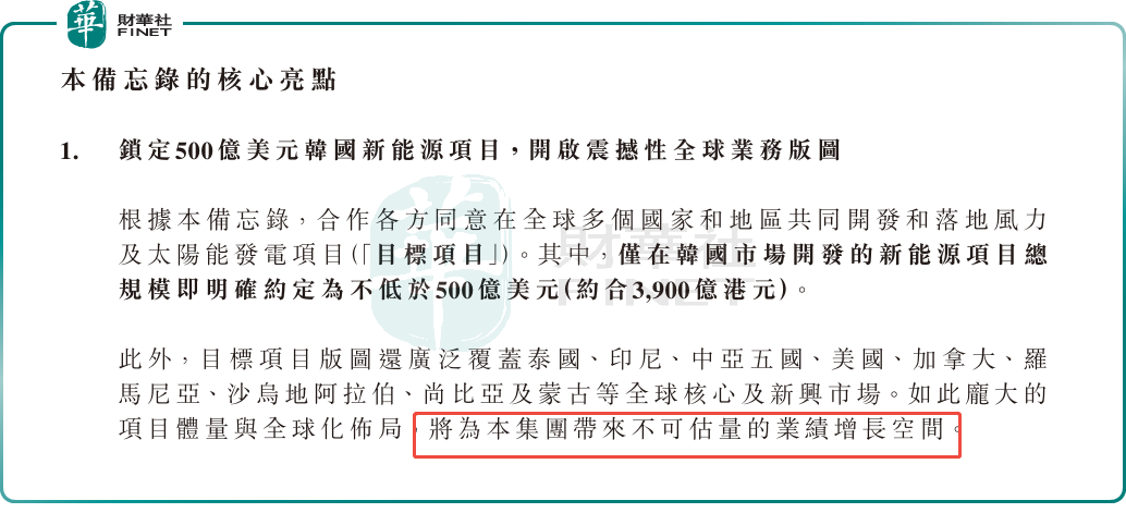 公告显示,4月12日玮俊生物科技作为总牵头方及控股方,与多家大型央企、海外跨国巨头及国际顶级金融机构签署新能源项目战略合作备忘录,拟在全球布局风电、光伏项目。其中韩国市场项目规模不低于500亿美元,约合3900亿港元,项目版图还覆盖泰国、印尼、中亚五国、美国、加拿大、沙特、赞比亚、蒙古等多国市场,整体规模迈向千亿级美元。
