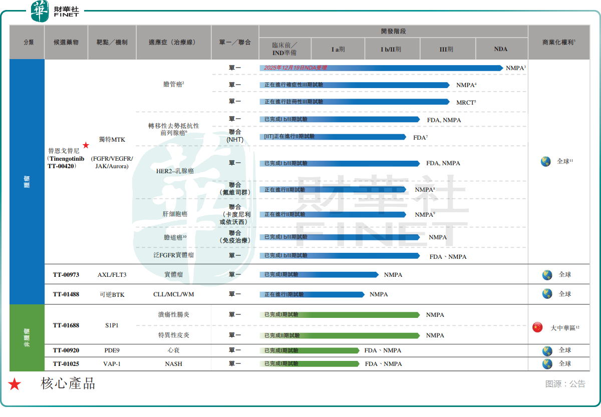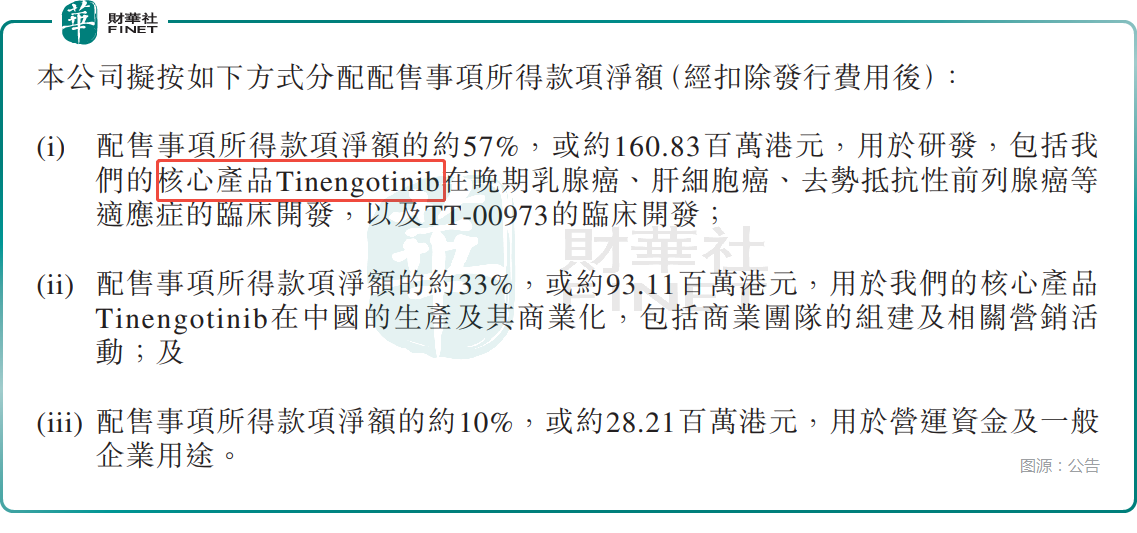 于2025年6月,公司通过IPO全球发售,净筹约1.61亿港元,其中约90%用于为核心产品Tinengotinib正在进行单药治疗胆管癌(CCA)的多区域注册III期临床试验提供资金。