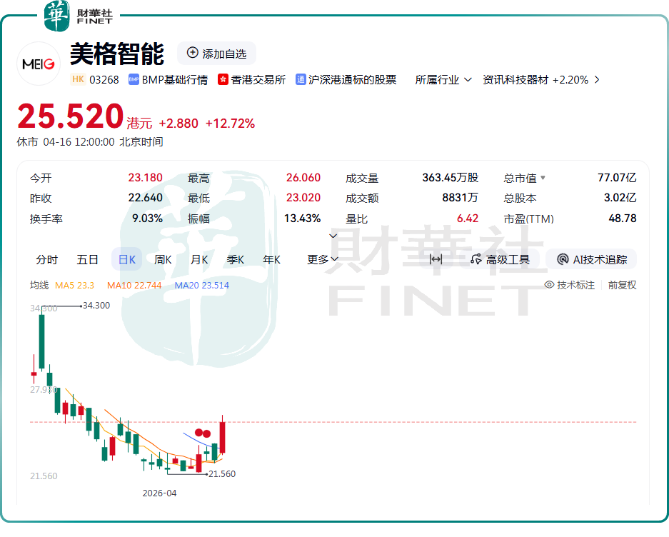 4月16日,国内无线通信模组龙头厂商——美格智能(03268.HK)股价迎来反弹,截至发稿,涨幅为12.72%,报25.52港元/股。值得注意的是,尽管当日表现亮眼,但该公司股价目前仍处于破发状态。