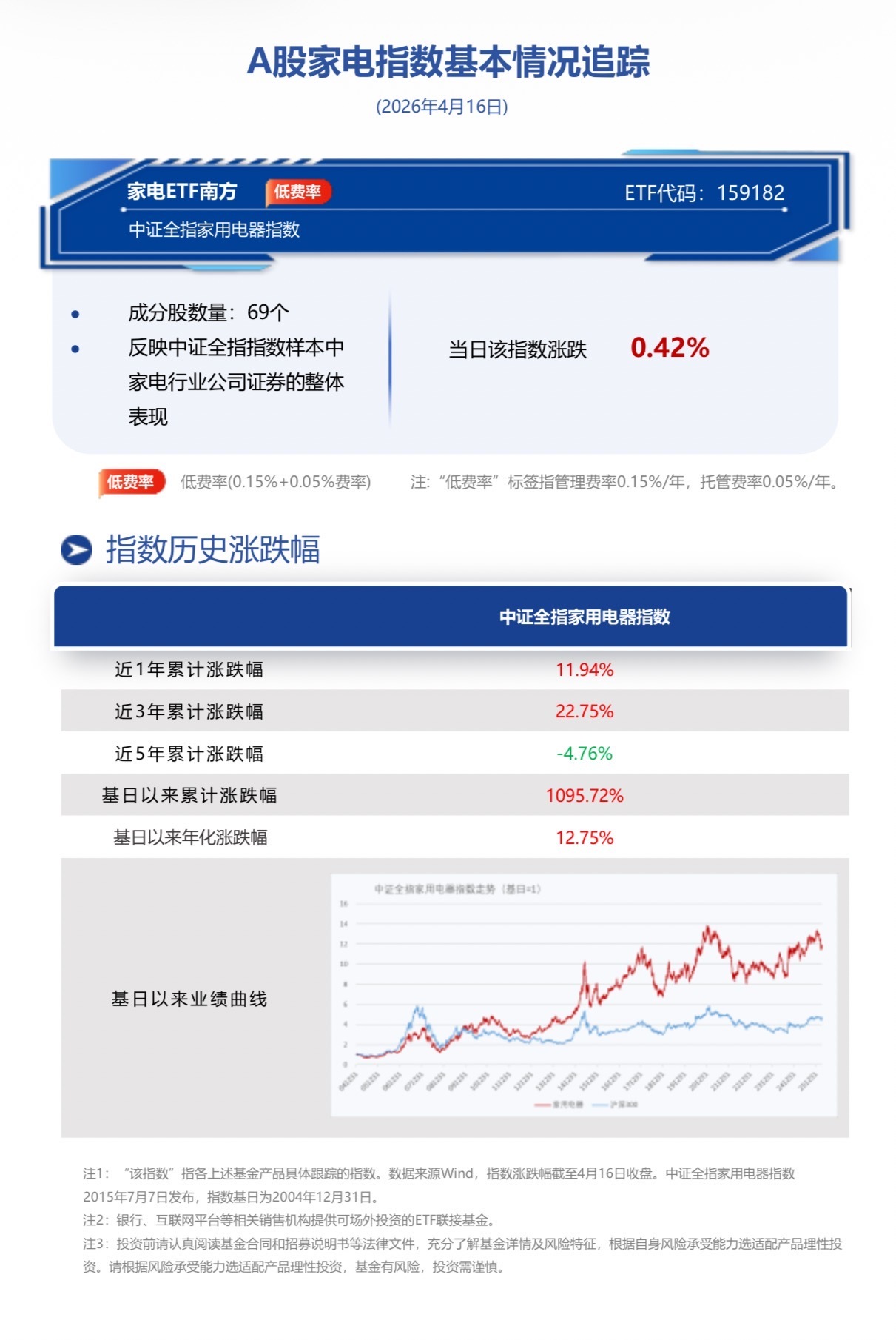 南方基金旗下家电ETF南方(159182)重磅发售中!截至2026年4月16日收盘,家电ETF南方(159182)跟踪标的指数中证全指家用电器指数(930697.CSI)涨0.42%。
