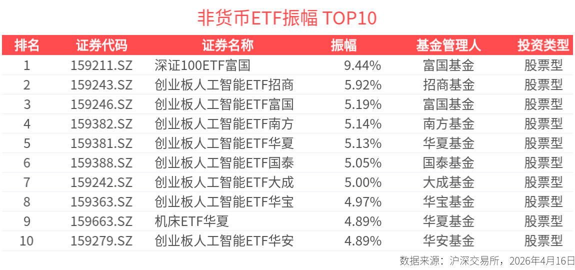 截至今日收盘,深证100ETF富国、创业板人工智能ETF招商、创业板人工智能ETF富国振幅居市场前列,分别达9.44%、5.92%、5.19%。