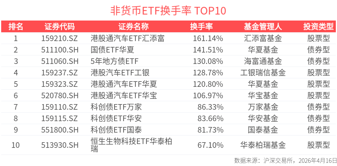 2026年4月16日,非货币类ETF合计成交4270.50亿元,其中有79只ETF成交额破10亿元。