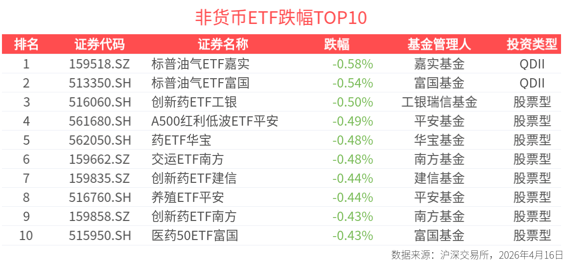 截至今日收盘,全市场共计72只非货ETF下跌,下跌比例达5%。行业主题指数方面,中证医药50指数、中证创新药产业指数跌幅居前,分别下跌0.50%、0.49%。