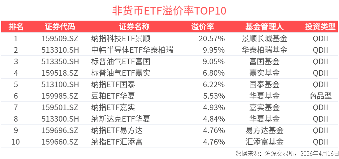 截至今日收盘,纳斯达克科技市值加权指数溢价居前,纳指科技ETF景顺收盘溢价20.57%;中证韩交所中韩半导体指数情绪高涨,中韩半导体ETF华泰柏瑞收盘溢价9.95%。