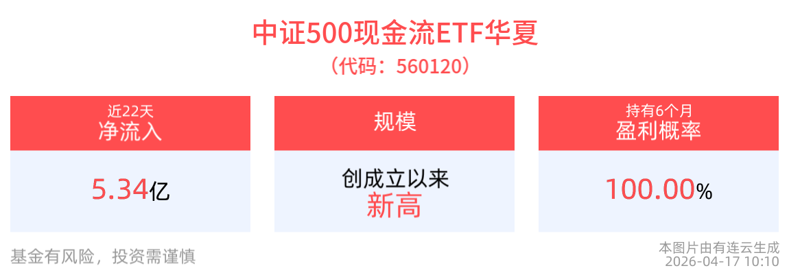 从收益能力看,截至2026年4月16日,中证500现金流ETF华夏自成立以来,最高单月回报为18.04%,最长连涨月数为3个月,最长连涨涨幅为28.85%,涨跌月数比为6/2,上涨月份平均收益率为6.94%,月盈利百分比为75%,月盈利概率为78.57%,历史持有6个月盈利概率为100%。