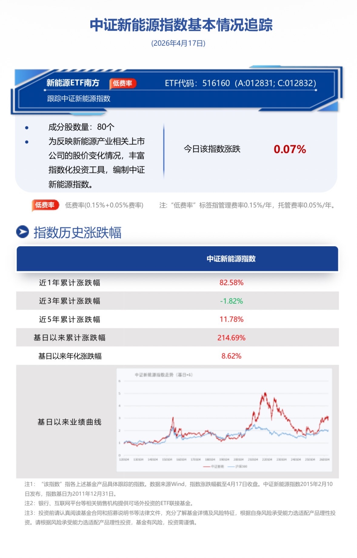 截至2026年4月17日收盘,新能源ETF南方(516160)换手3.31%,成交2.62亿元,跟踪标的指数中证新能源指数(399808.SZ)涨0.07%。
