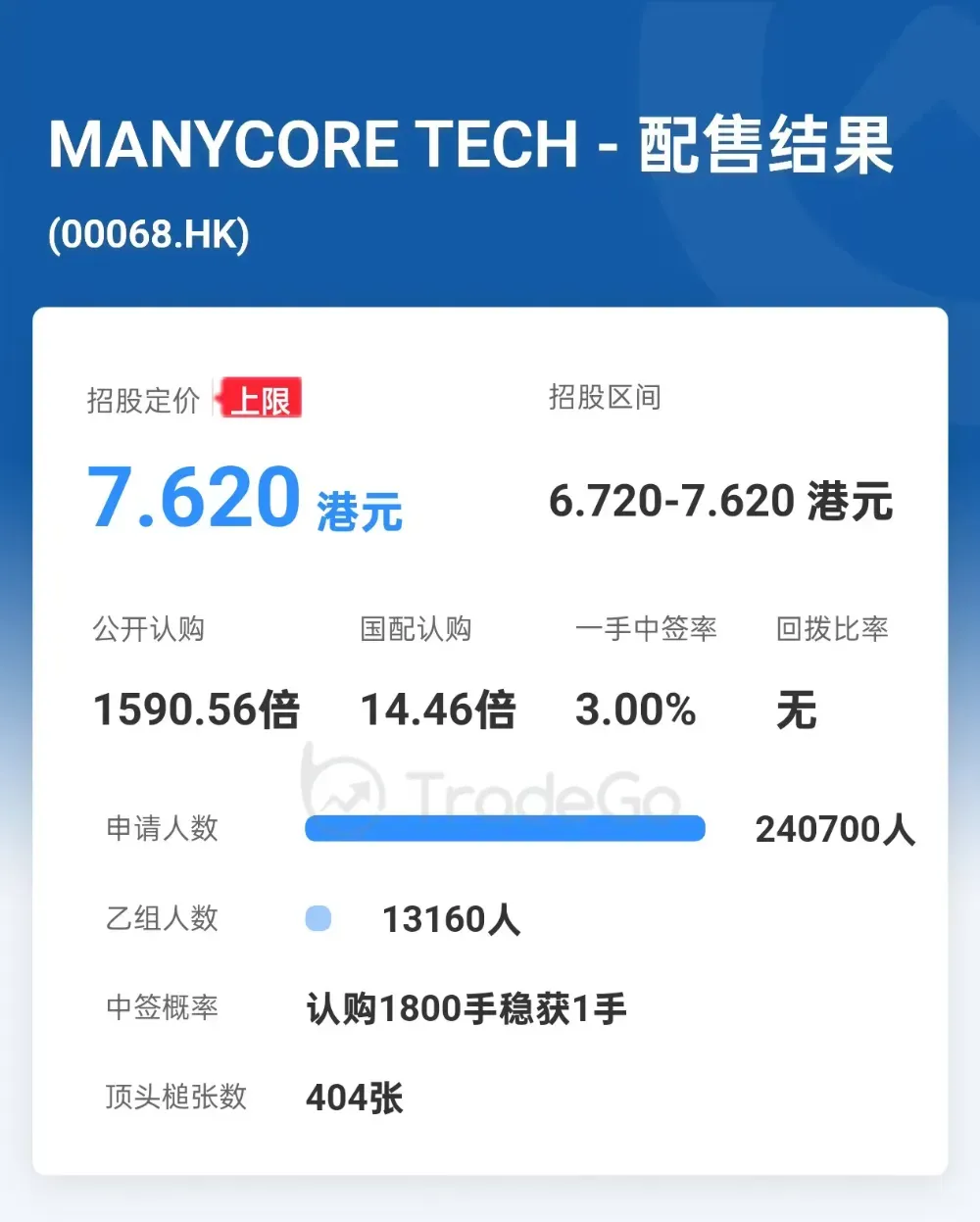 配售结果显示,群核科技本次申购人数共240700人,公开认购1590.56倍,国配认购14.46倍,无回拨,一手中签率3.00%。