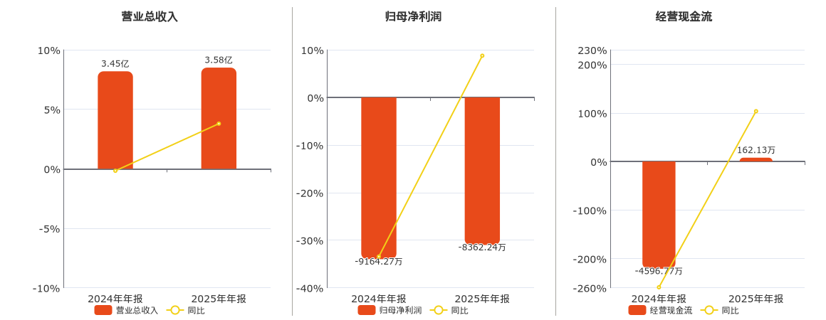 公司营业总收入为3.58亿元,较去年同报告期营业总收入增加1306.61万元,同比较去年同期上涨3.79%。归母净利润为-8362.24万元,较去年同报告期归母净利润增加802.04万元。经营活动现金净流入为162.13万元,较去年同报告期经营活动现金净流入增加4758.90万元。