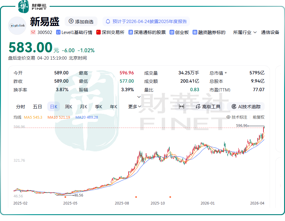 从资本市场表现来看,新易盛(300502.SZ)走出了强势行情。该股自2025年4月初触及46.56元/股阶段低点启动,到如今最高触及596.96元/股的历史高位,仅一年多时间,新易盛股价区间累计涨幅最高达11.82倍,市值增长逾5400亿元,成为A股市场名副其实的“大牛股”,充分体现了市场对公司发展前景的高度认可与积极预期。