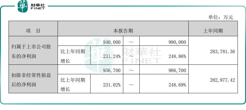 新易盛预计,2025年,归母净利润94亿元至99亿元,同比增长231.24%至248.86%;扣非净利润93.67亿元至98.67亿元,同比增长231.02%至248.69%。