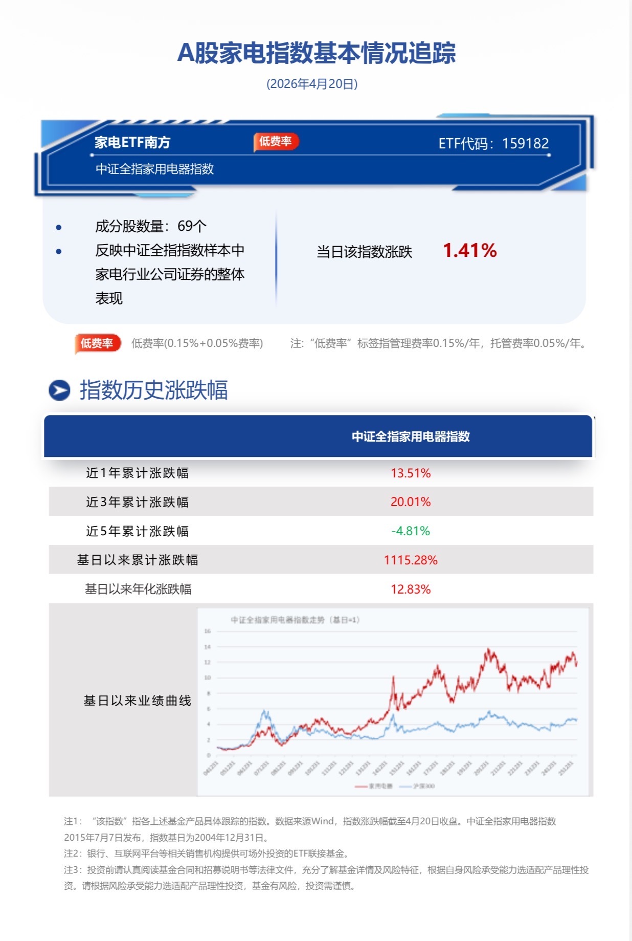 截至2026年4月20日收盘,家电ETF南方跟踪标的指数中证全指家用电器指数(930697.CSI)涨1.41%。