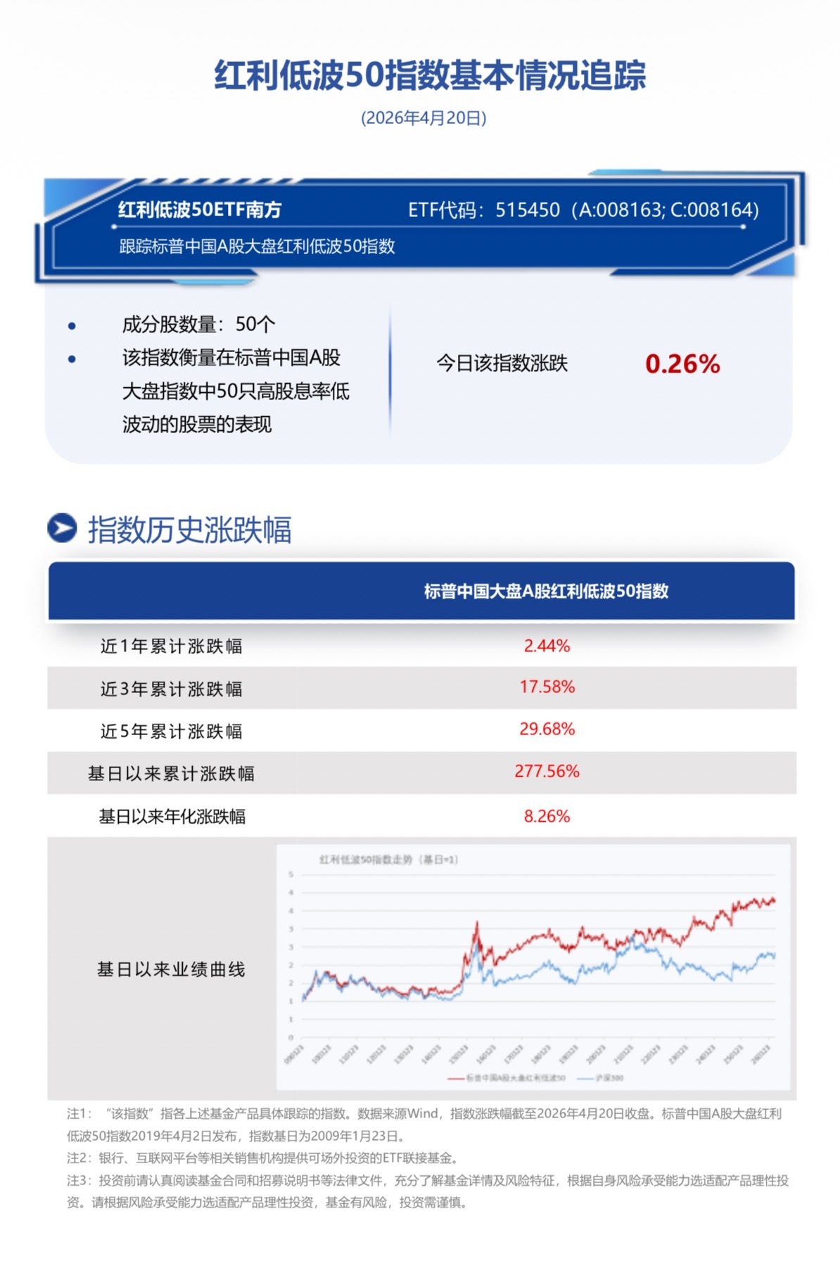 中东局势演进反复,不过当下资金对于海外宏观变量略有钝化,但后续地缘博弈的曲折仍需留意,同时个别板块连创新高后资金潜在的获利需求需关注,在此期间红利资产可以承接部分低波配置需求、适合作为组合配置底仓。中期看,当下红利低波的优势在于相对估值,当市场风险偏好下降时,成长股高位波动大,而红利低波的防御属性依然有效。从长期来看,红利低波作为一类生息资产,股息率仍具有较强的吸引力。红利低波50ETF南方(515450.SH)跟踪标普中国A股大盘红利低波50指数,指数相比同类超配电力以及大消费板块;截至2026年4月17日,据Wind,红利低波50股息率按整体法计算为4.5%。
