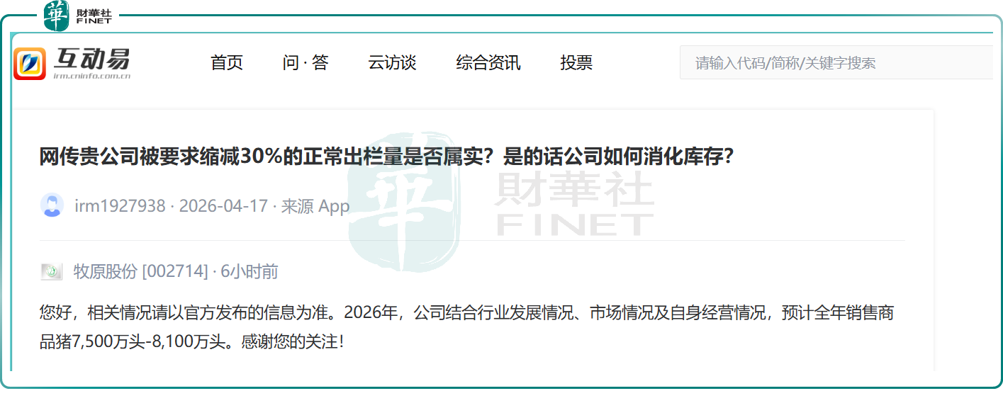 4月20日,有投资者在互动平台向牧原股份(02714.HK)提问,就网传公司被要求缩减30%正常出栏量的消息真实性及库存消化方案进行求证。