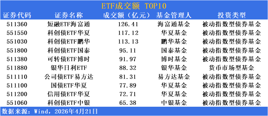 短融ETF海富通(511360)单日成交超126亿元稳居成交榜榜首,作为短久期信用债工具持续担当资金管理利器,受益于市场资金面宽松背景下的现金管理需求升温。