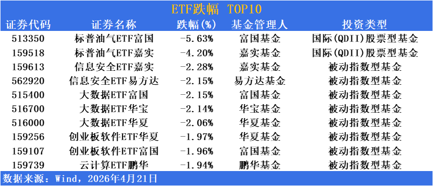 跌幅方面,国际油价持续回落,油气主题ETF再度大幅领跌