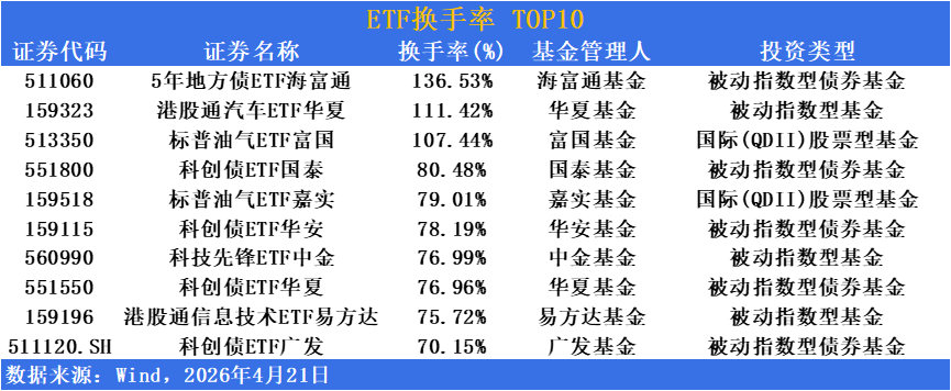 活跃度方面,短融ETF成交超126亿位居榜首,5年地方债ETF海富通换手率超136%高居榜首。