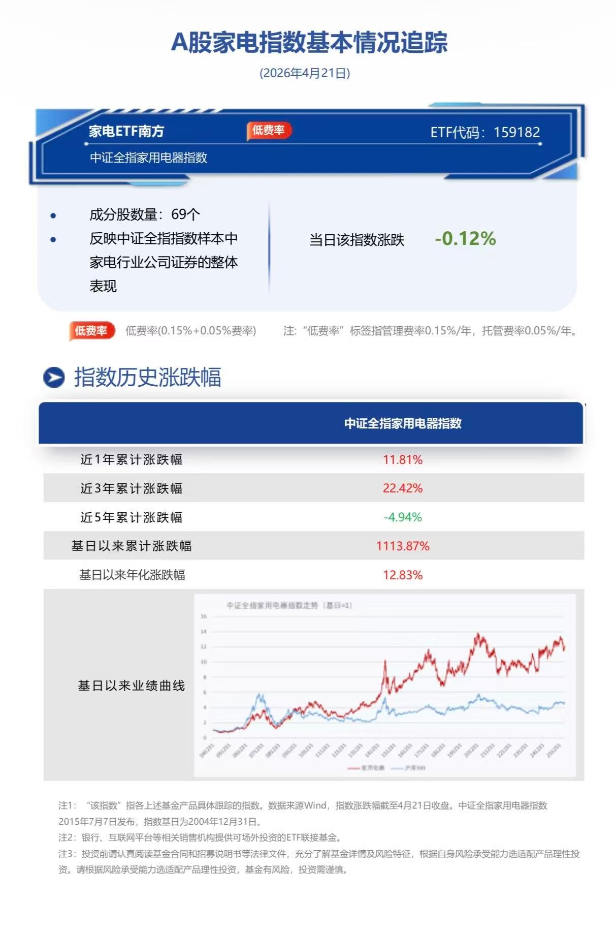 截至2026年4月21日收盘,家电ETF南方跟踪标的指数中证全指家用电器指数(930697.CSI) 跌0.12%。